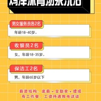 鸡泽沐青汤泉洗浴招聘1、男女服务员各2人,年龄18--40岁2、收银员2名,女性,年龄18--35岁3、保洁2名,男性,年龄65岁以下薪资结