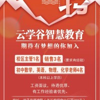 云学谷智慧教育期待有梦想的你加入1、校区主管1名2、初中数学,英语,物理,化学老师4名(本科以上学历)工资面议,待遇优厚。有