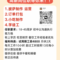 北京招聘1.披萨制作 运营2.订单打包3.小吃制作4.学徒工任职要求:18-45周岁 初中以沟通执行能力强有上学历 吃苦耐劳 餐饮工作经