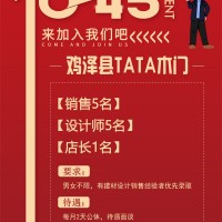 鸡泽县TATA木门招聘销售5名,设计师5名,店长1名,男女不限,待遇面谈。有建材设计销售经验者优先录取,每月2天公休。地址:九鼎