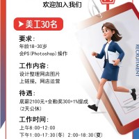 明瑶家居招聘美工30名薪资:底薪2100元+全勤奖300+1%提成(2天公休)工作:设计整理网店图片,上链接,网店运营要求:年龄18-30岁