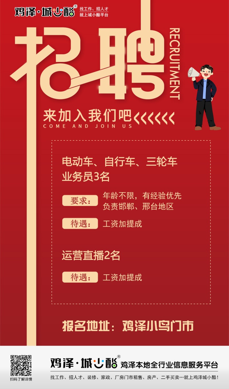 鸡泽县城招聘技术总监:月薪10k-20K【职位待遇】1. [工资待遇]:10K-20K+奖金+五险(全面职工社保)2. [福利] 每周双休+法定节假