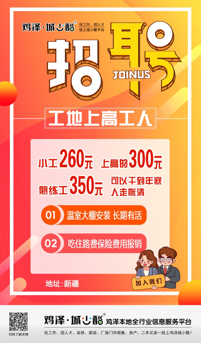新疆工地20万平米温室大棚长期找安装工,小工260,可以上高300,熟练工350,可以小包,长期有活,可以干到年底,吃住路费保险费