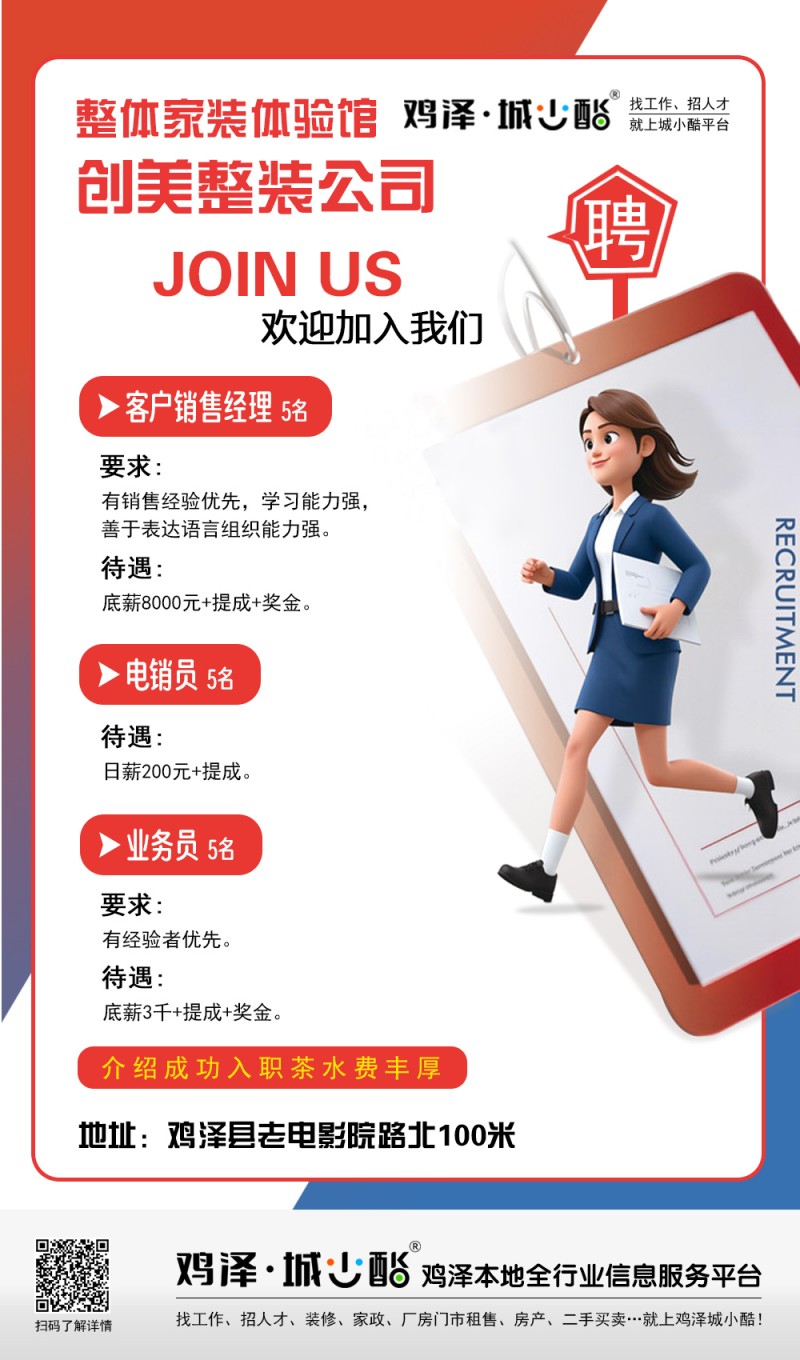 整体家装体验馆创美整装公司招聘客户销售经理底薪8000+提成+奖金、电销员薪200+提成、业务员底薪3千+提成+奖金。地址:鸡泽县老电影院路北100米