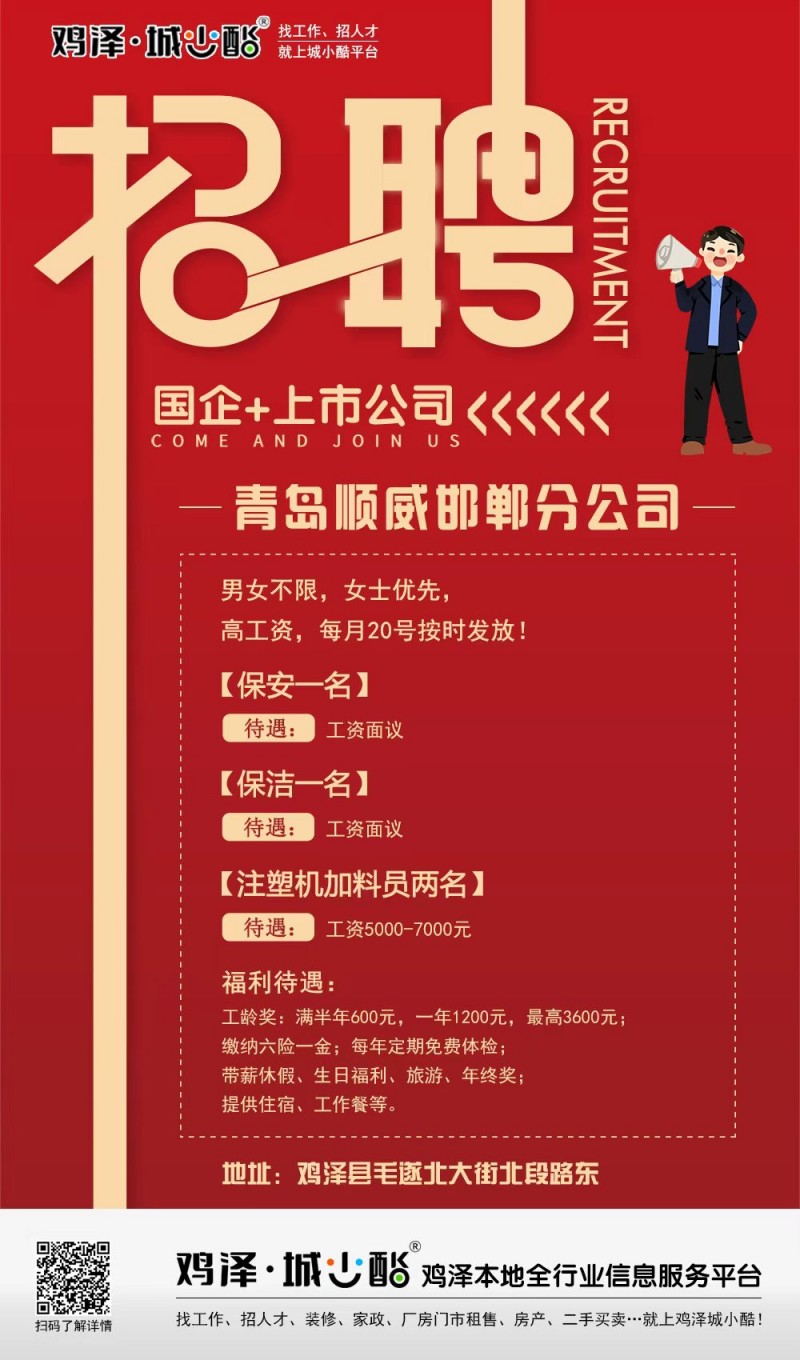 青岛顺威邯郸分公司招聘保安、保洁、注塑机加料员,工资面议。提供住宿、工作餐等。地址:鸡泽县毛遂北大街北段路东
