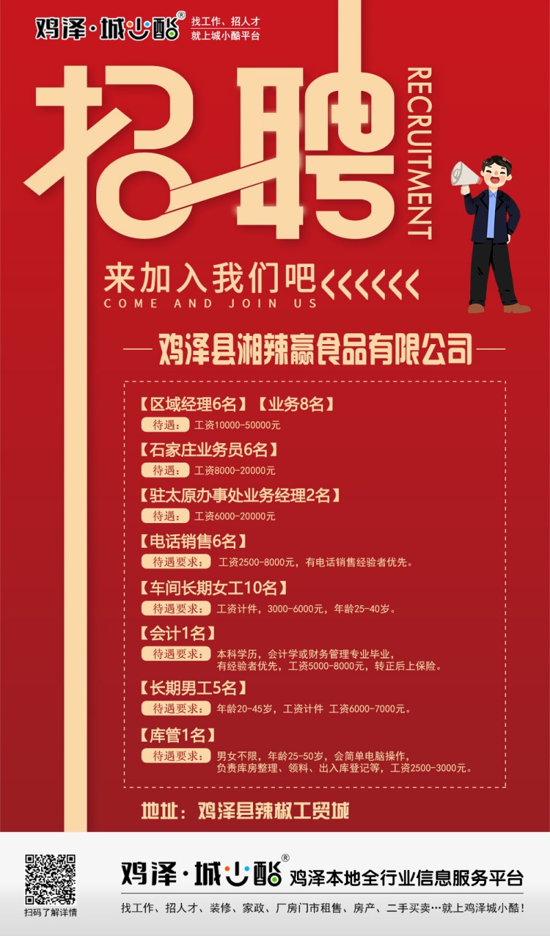 鸡泽县湘辣赢食品有限公司招聘女工10名、男工5名,电话销售6名,会计1名,库管1名。地址:鸡泽县辣椒工贸城