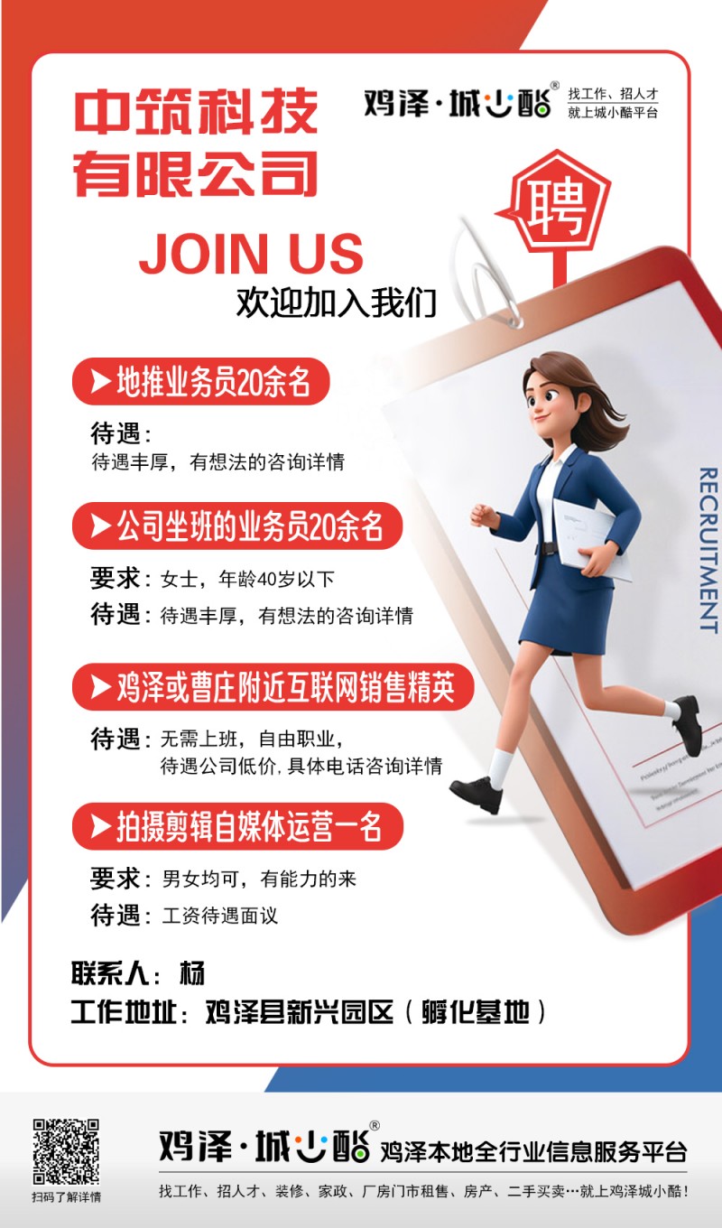 邯郸市中筑科技有限公司招聘地推业务员、销售精英、公司坐班的业务员、互联网销售精英、外贸业务员。工作地址,鸡泽县新兴园区(孵化基地)