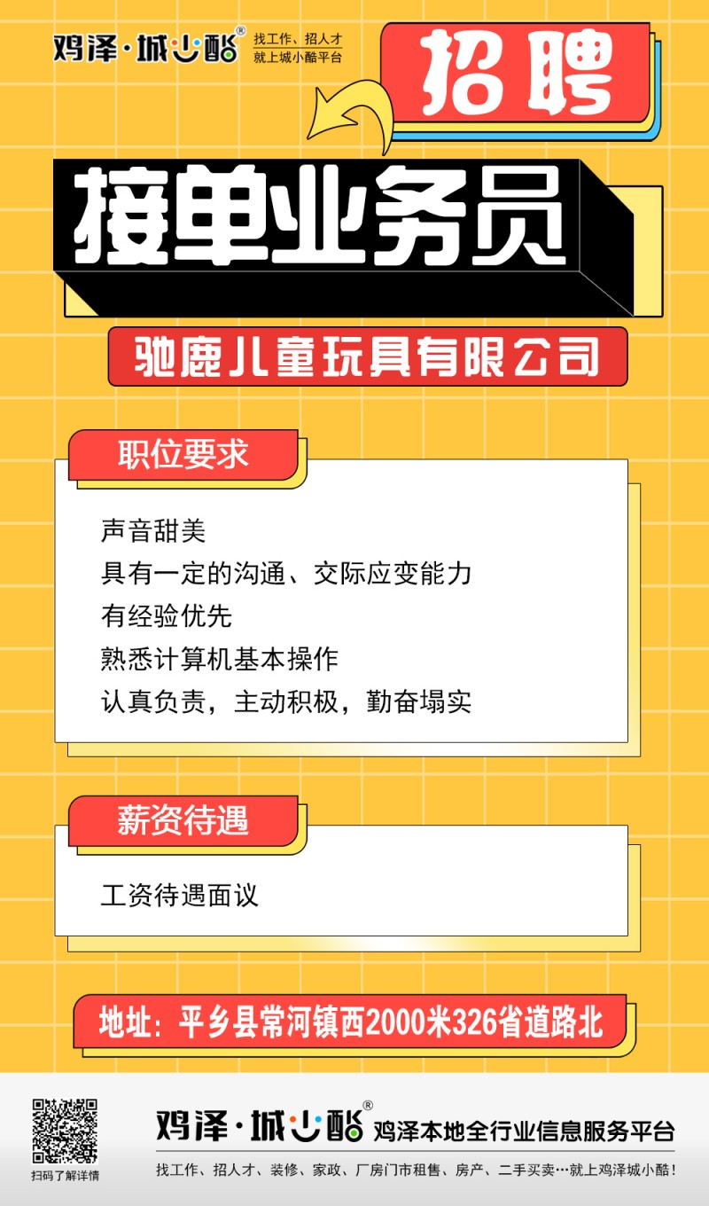 驰鹿儿童玩具有限公司诚聘接单业务员,巡检员、质检员,工资待遇面议。地址:平乡县常河镇西2000米326省道路北