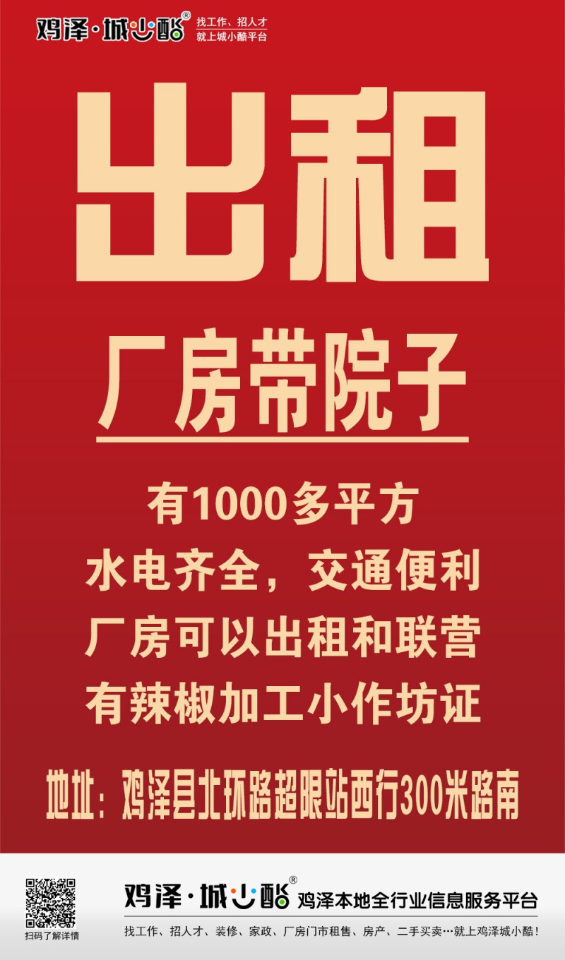 出租厂房,厂房带院子有1000多平方,水电齐全,交通便利,(厂房可以出租和联营)有辣椒加工小作坊证。