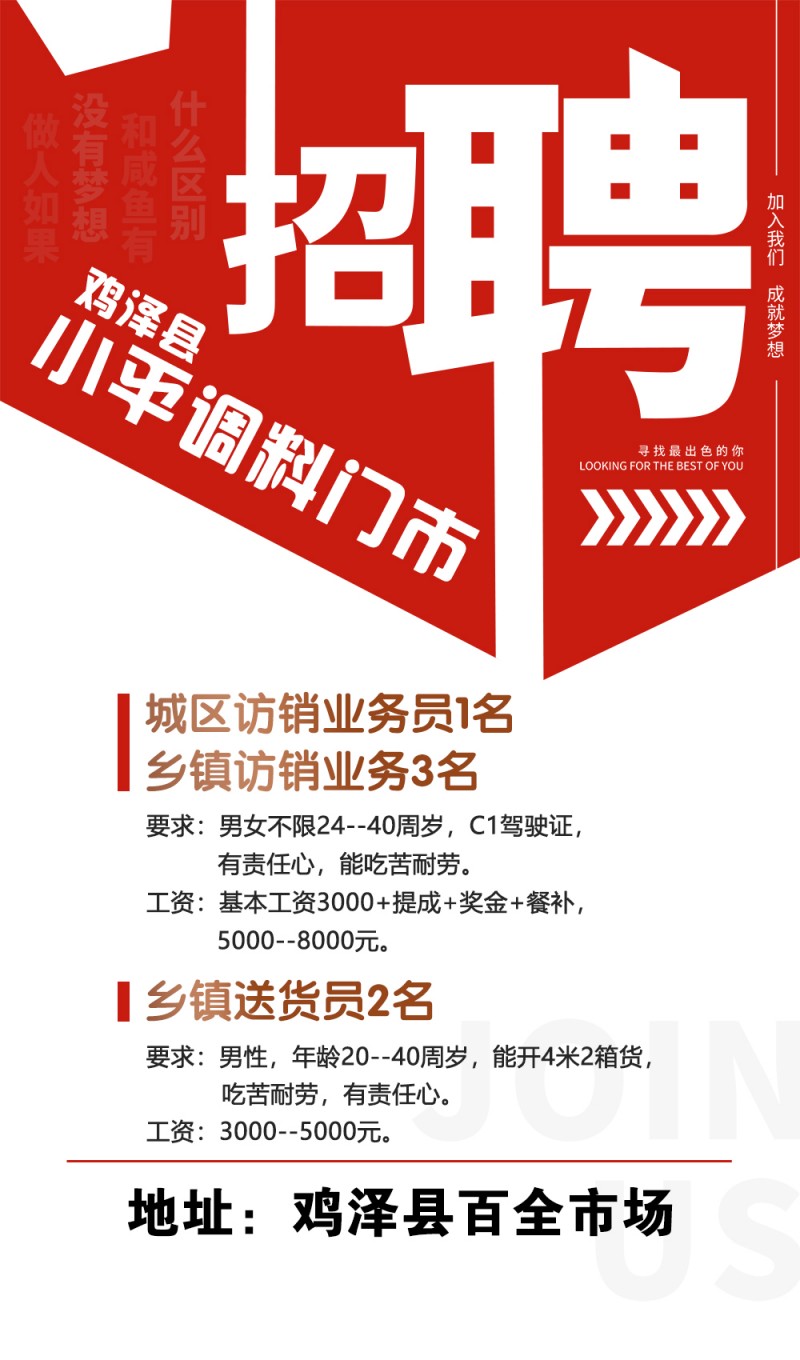 鸡泽县小平调料门市招聘城区访销业务员1名,乡镇访销业务3名基本工资3000--8000,乡镇送货员2名3000--5000。地址:鸡泽县百全市场
