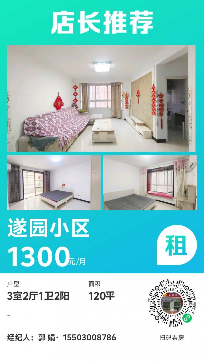 出租遂园小区,电梯房,三居室,家具家电齐全,集体取暖,15000一年。