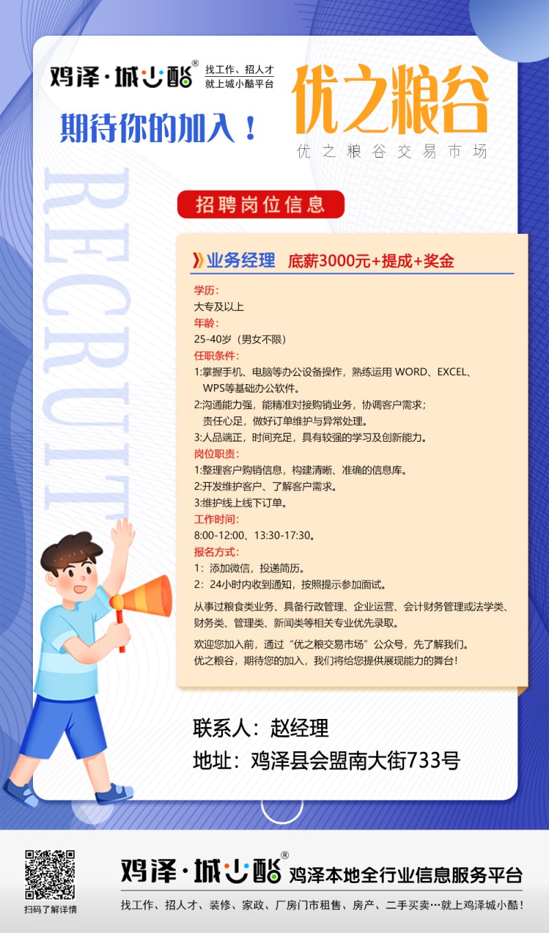 优之粮谷交易市场招聘业务经理 ,薪资:底薪 3000+提成+奖金。 工作地址: 河北邯郸鸡泽会盟南大街733号