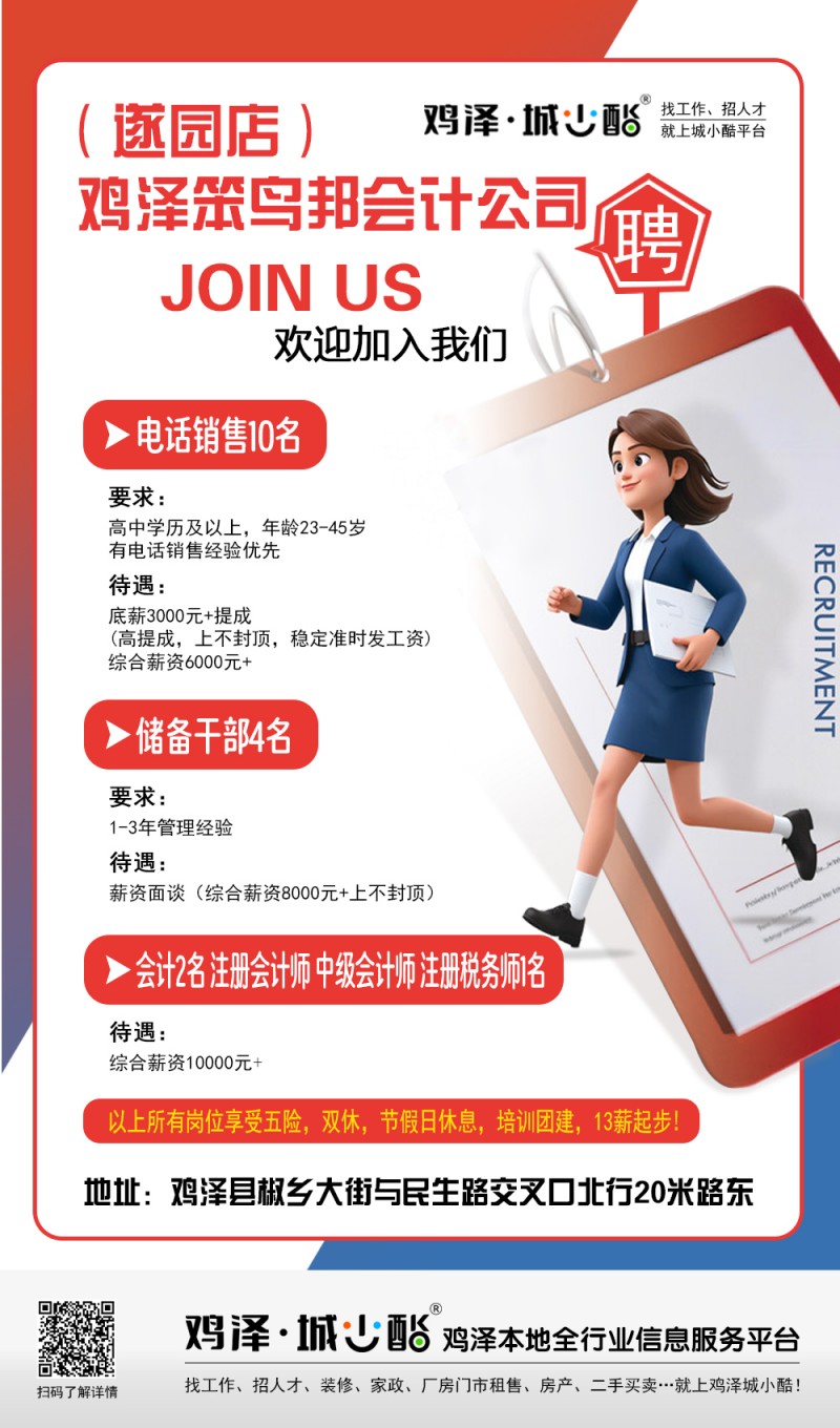 鸡泽笨鸟邦会计公司(遂园店)诚聘电话销售10名,综合薪资6000➕、储备干部4名,综合薪资8000➕。地址:鸡泽县椒乡大街与民生路交叉口北行20米路东