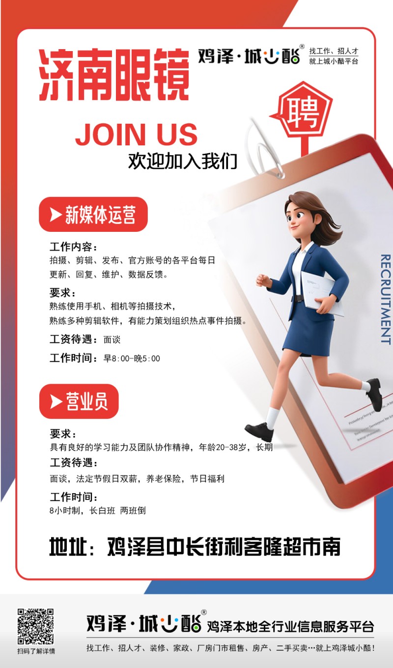 【济南眼镜】诚招新媒体运营,工作时间:早8:00-晚5:00,工资待遇:面谈。地址:鸡泽县中场街利客隆超市南 济南眼镜