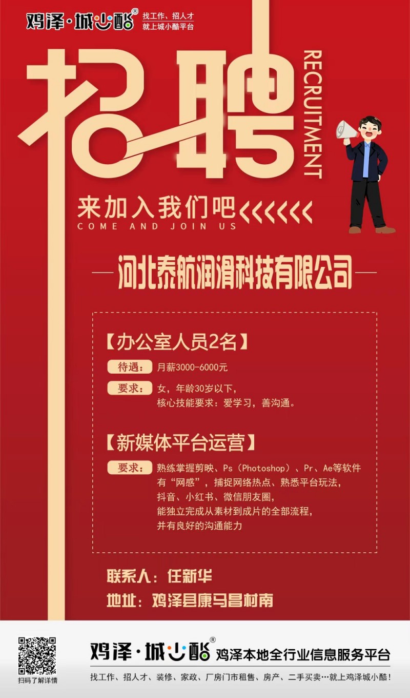 鸡泽县创优教育招聘岗位:全职初中部:优秀英语教师2名,优秀数学教师2名小学部:优秀英语教师5名,优秀数学老师2名薪资待遇:40