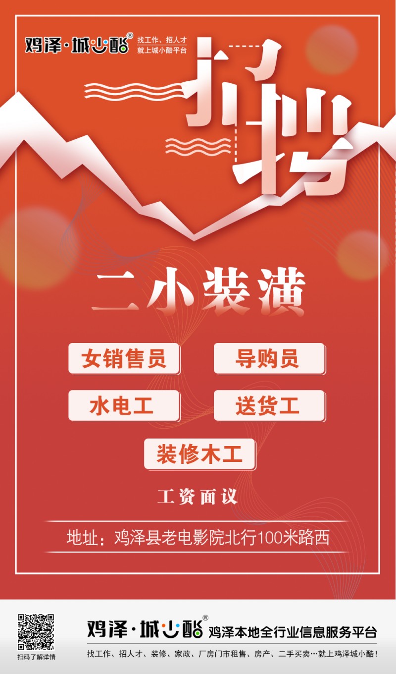 鸡泽县小平调料门市招聘1、城区访销业务员1名,乡镇访销业务3名,工资:基本工资3000十提成十奖金十餐补十公休2天5000--8000。业