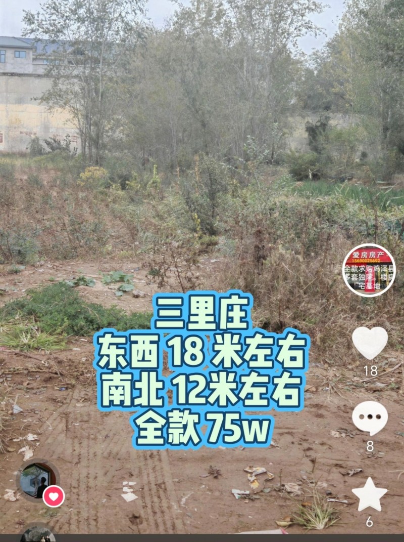 出售。三里庄村。宅基地。东西18米左右。南北12米左右。全款75万。微信同号