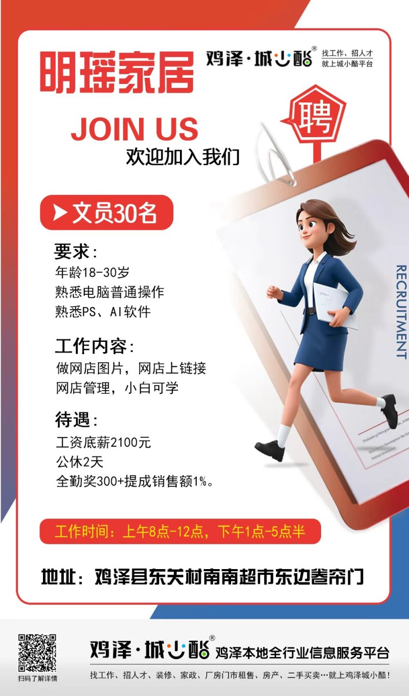 明瑶家居招聘文员30名,待遇:工资底薪2100元,公休2天,全勤奖300➕提成销售额1%。地址:鸡泽县东关村南南超市东边卷帘门