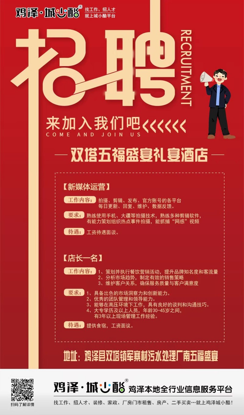 双塔五福盛宴礼宴酒店诚招新媒体运营,工资待遇:面谈。地址:鸡泽县双塔镇军寨村污水处理厂南五福盛宴