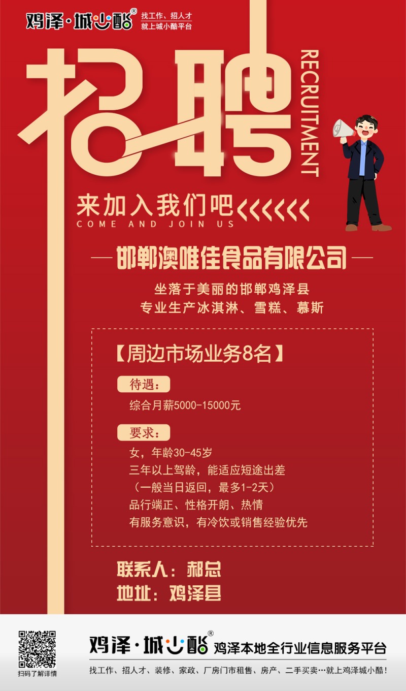 邯郸澳唯佳食品有限公司招聘周边市场业务8名,三年以上驾龄,综合月薪5000-15000元。地址:鸡泽县鸡泽镇新兴园区梦蛟路北毛遂北大街西院内