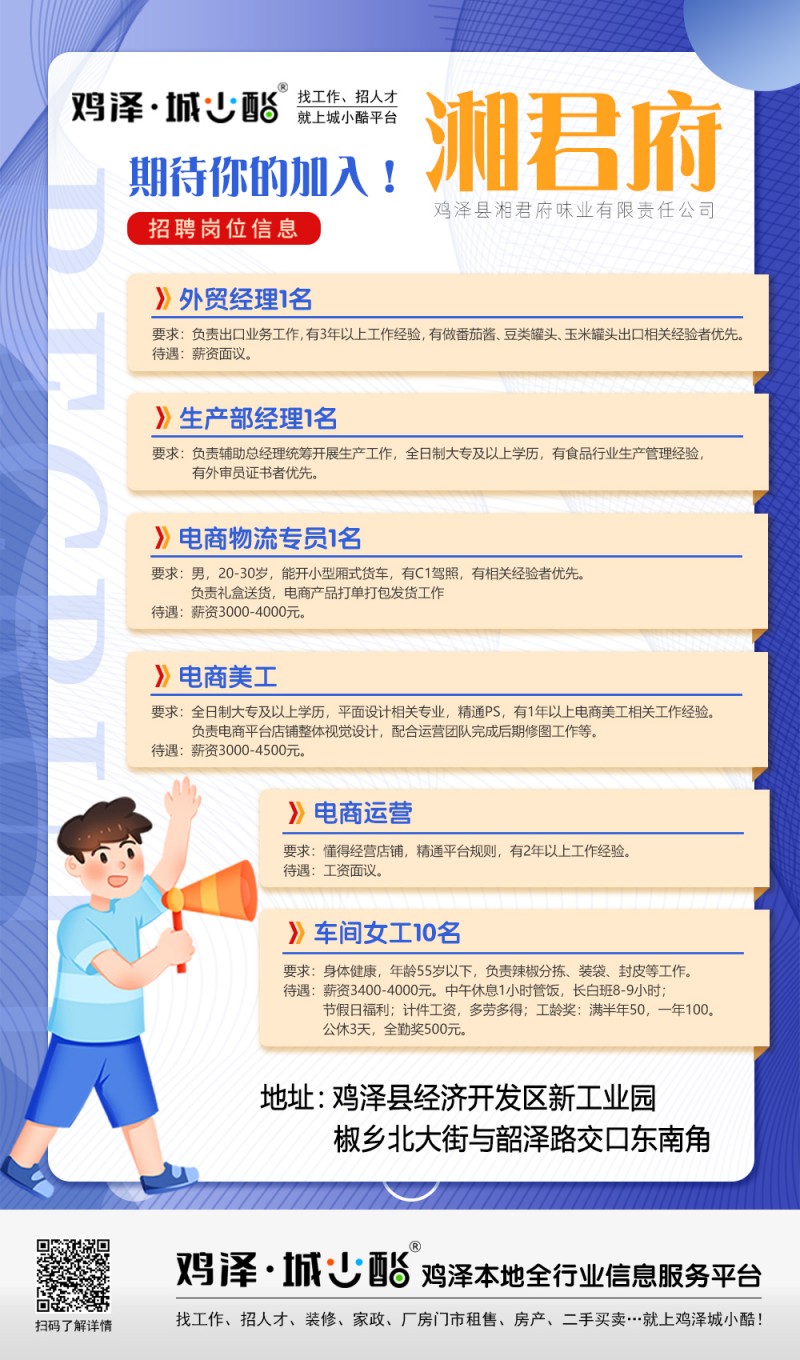鸡泽县湘君府味业有限责任公司诚聘电商美工,薪资3000-4500元。地址:鸡泽县经济开发区新工业园,椒乡北大街与韶泽路交口东南角