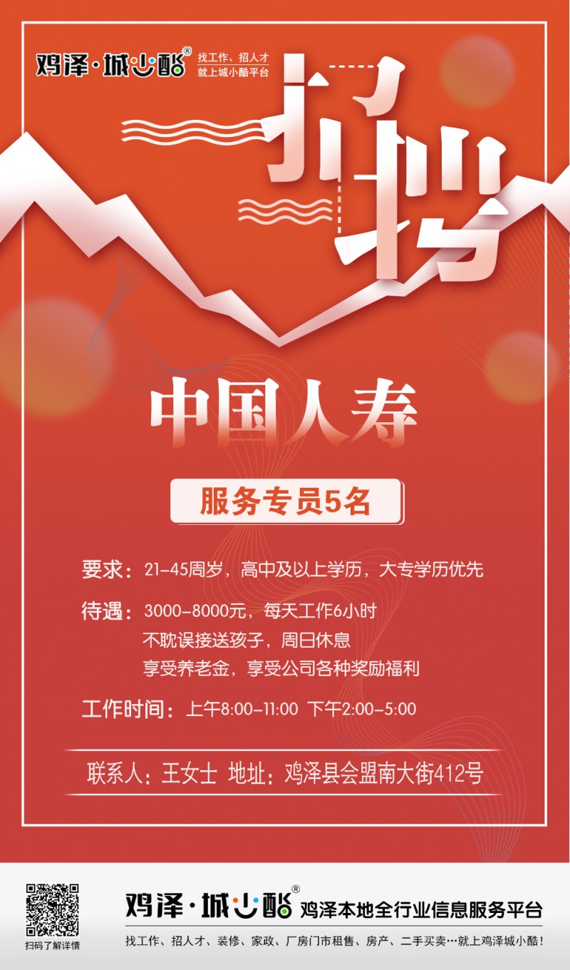 中国人寿招募服务专员5名,待遇:3000元-8000元,享受养老金;享受公司各种奖励福利。地址:鸡泽县会盟南大街412号