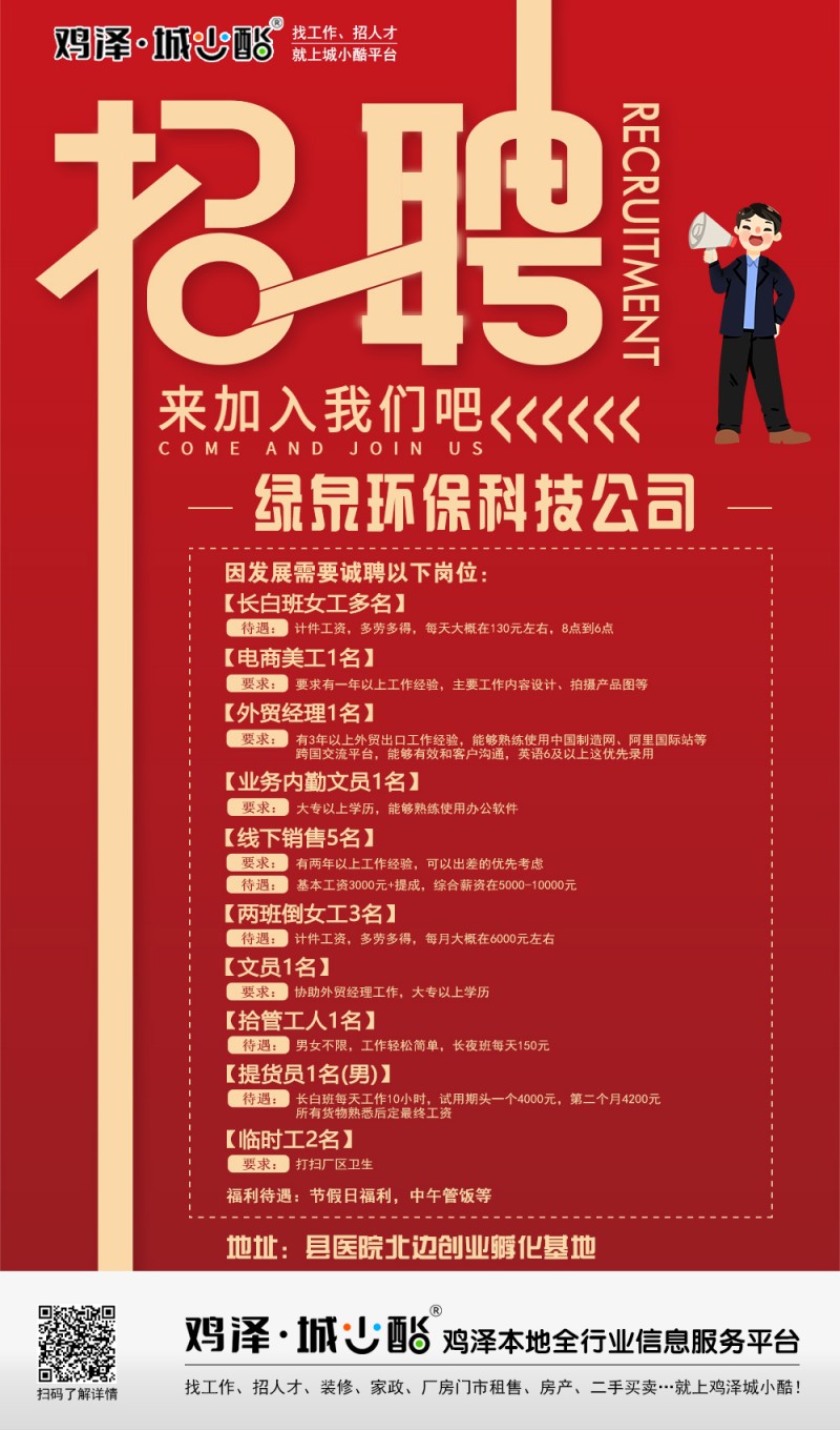 绿泉环保科技公司诚聘长白班女工多名,文员1名,两班倒女工3名,提货员1名,临时工2名,前夜班包装机女工。福利待遇:节假日福利,中午管饭等。 地址:县医院北边创业孵化基地