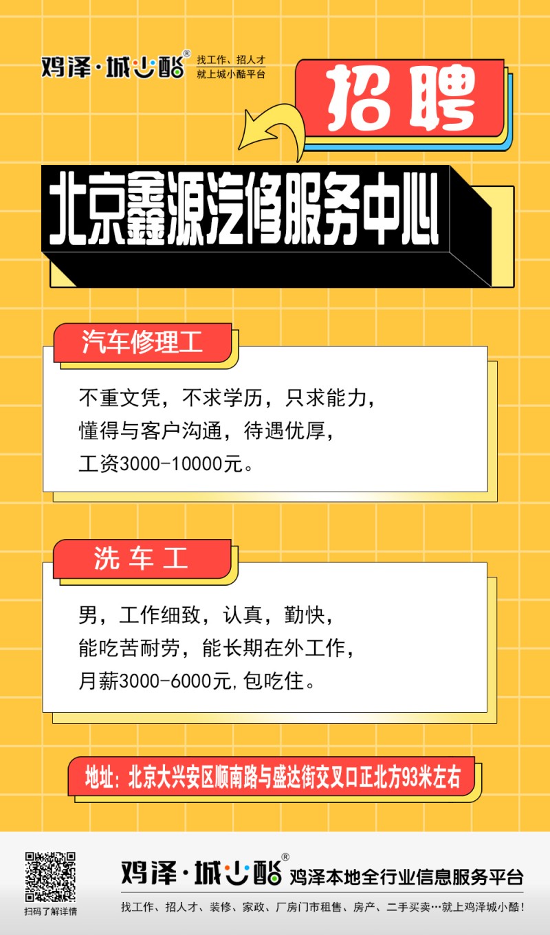 北京鑫源汽修服务中心招聘汽车修理工,工资3000--10000元。洗车工,男,月薪3000至6000元。地址:北京大兴安区顺南路与盛达街交叉口正北方93米左右