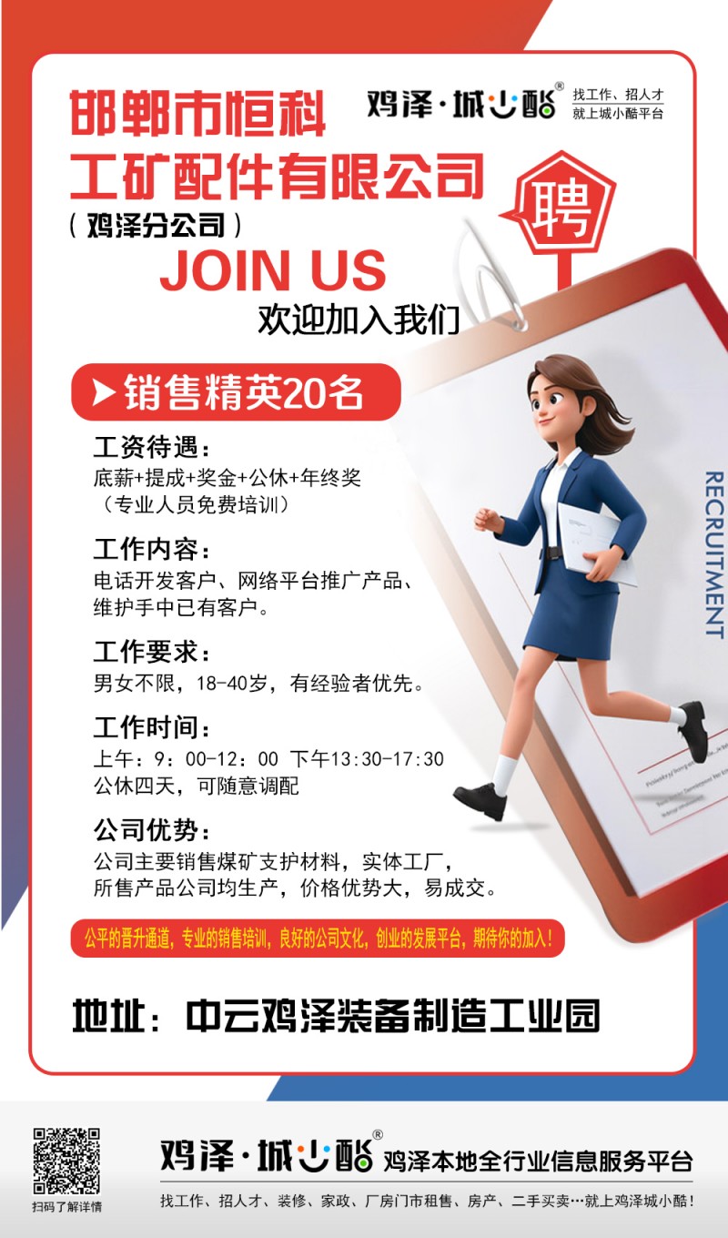 邯郸市恒科工矿配件有限公司(鸡泽分公司) 招聘销售精英、电话客服20名,男女不限,年龄18-40岁,底薪+提成+奖金+公休+年终奖,地址:中云鸡泽装备制造工业园