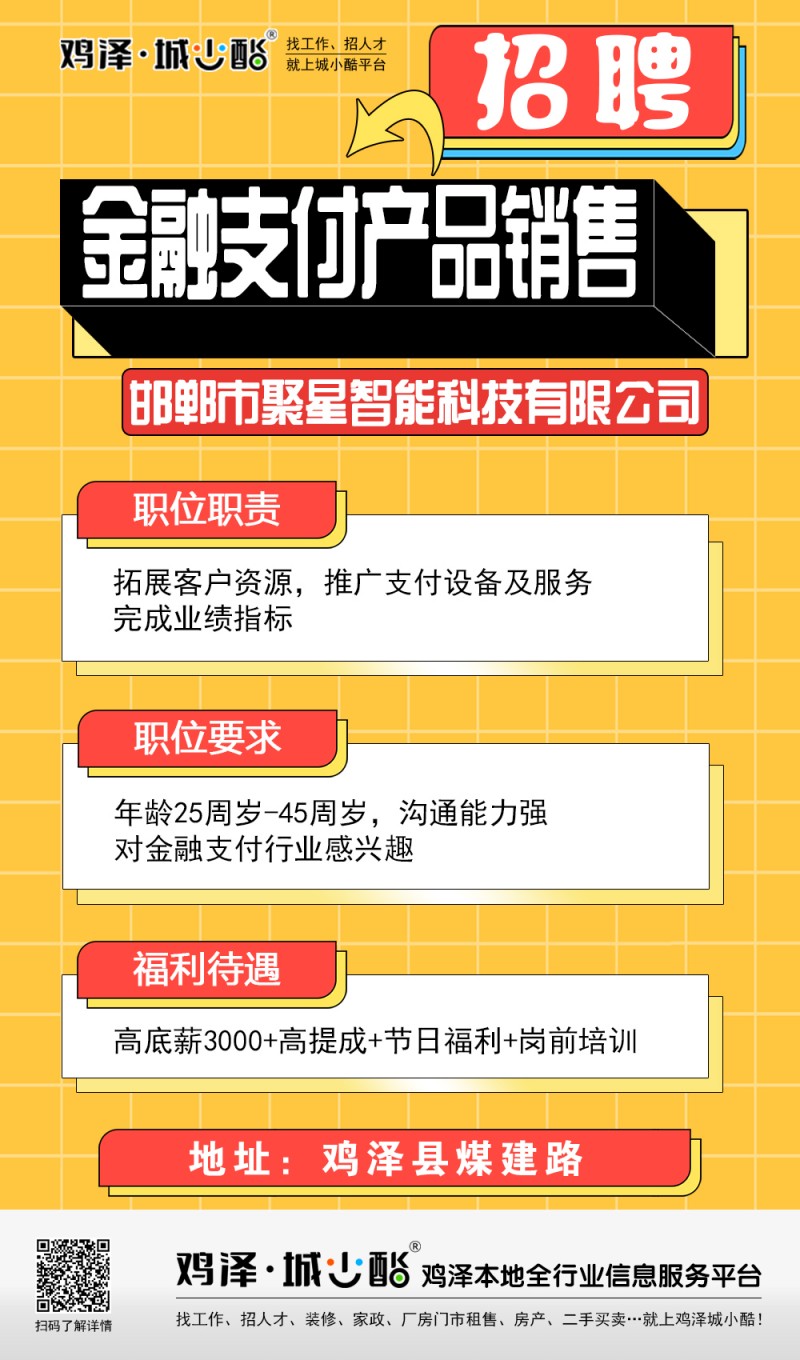 邯郸市聚星智能科技有限公司诚招销售精英,年龄25周岁-.-45周岁,高底薪3000+高提成+节日福利+岗前培训。地点:鸡泽县煤建路