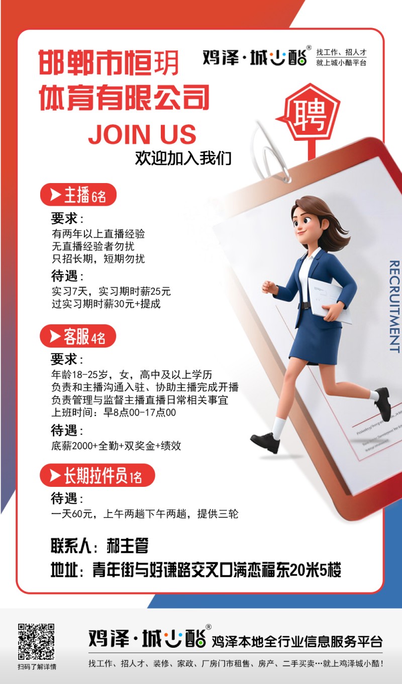 邯郸市恒玥体育有限公司招聘主播6名,时薪30元+提成,客服4名,底薪2000+全勤+双奖金+绩效。地址:青年节与好谦路交叉口满恋福东20米5楼
