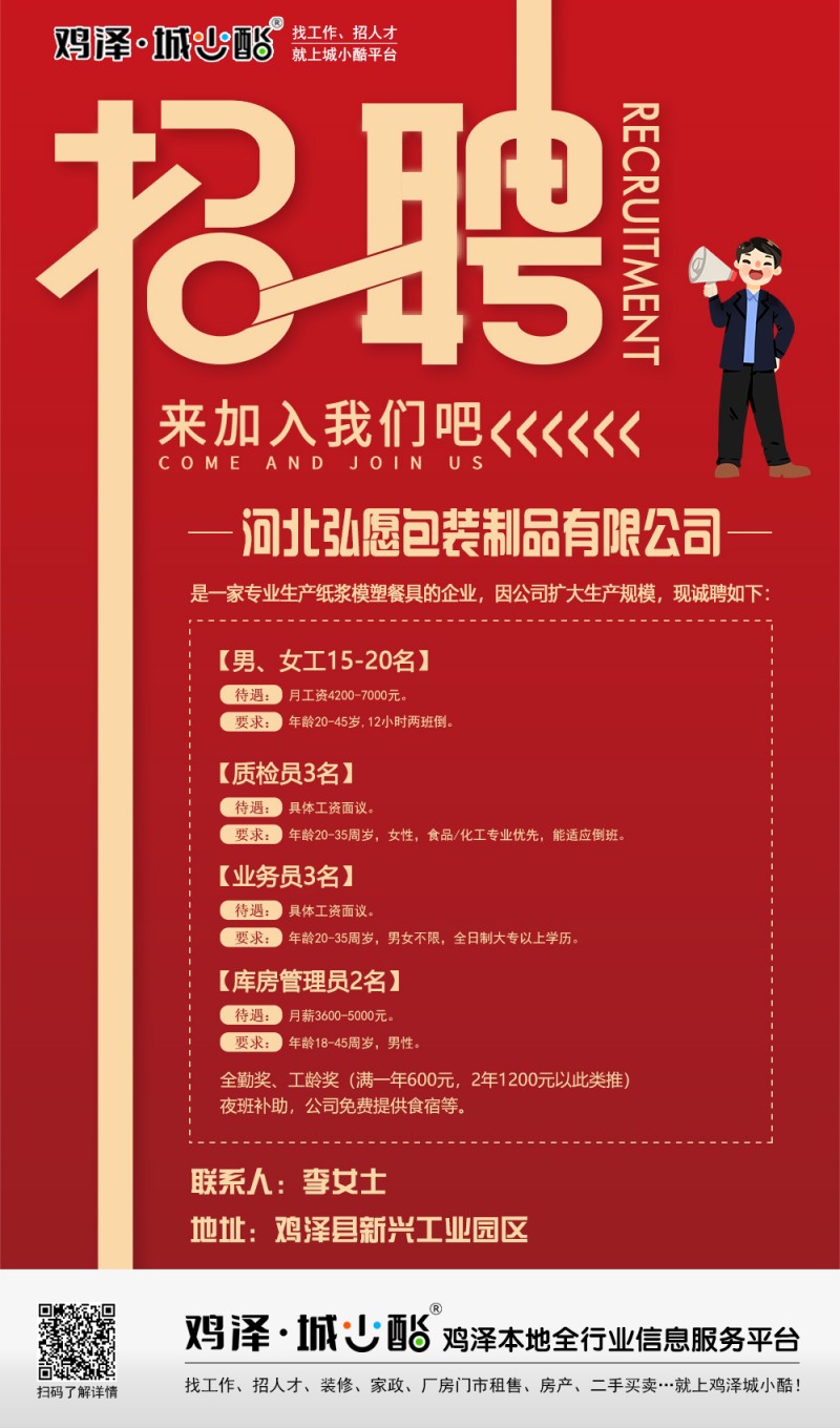 河北弘愿包装制品有限公司诚聘男、女工、质检员3名,业务员3名,库房管理员2名,全勤奖、工龄奖,夜班补助,公司免费提供食宿等。地址:鸡泽县新兴工业园区