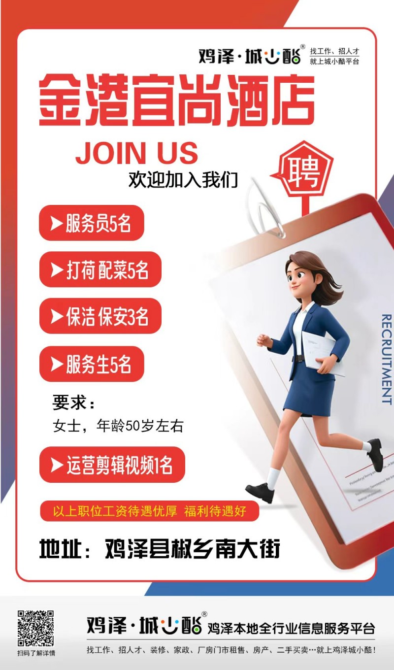 金港宜尚酒店招聘服务员、打荷、配菜、保洁、保安、服务生、运营剪辑视频,以上职位工资待遇优厚 福利待遇好。地址:鸡泽县椒乡南大街