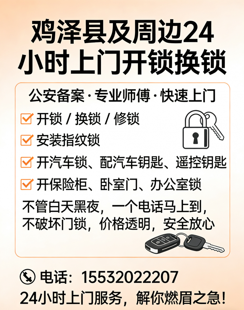 鸡泽县开锁换锁|24小时上门|配汽车钥匙 鸡泽本地师傅|公安备案|正规安全|明码标价 ⏰24小时上门,随叫随到 服务项目 开防盗门、卧室门、办公室锁 换锁芯、修锁、装指纹锁 开汽车锁、配汽车芯片钥匙、遥控钥匙 开保险柜、文件柜、玻璃门锁 服务优势 ✅鸡泽县城及周边快速上门 ✅专业无损开启,不破坏锁具 ✅价格透明,无隐形消费 ✅正规备案,安全放心 遇事不慌,一个电话,解您“锁”难!