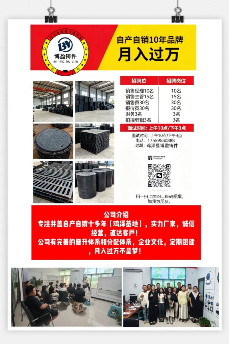 博盈铸件招聘销售,工资1800-10000元,上不封顶,短视频运营,工资2800-3500元,地址:鸡泽县会盟南大街