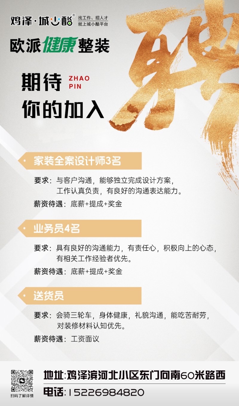 欧派健康整装招聘设计师4名,工资5000-10000元,销售员5名,地址:鸡泽县滨河北小区东门南行60米
