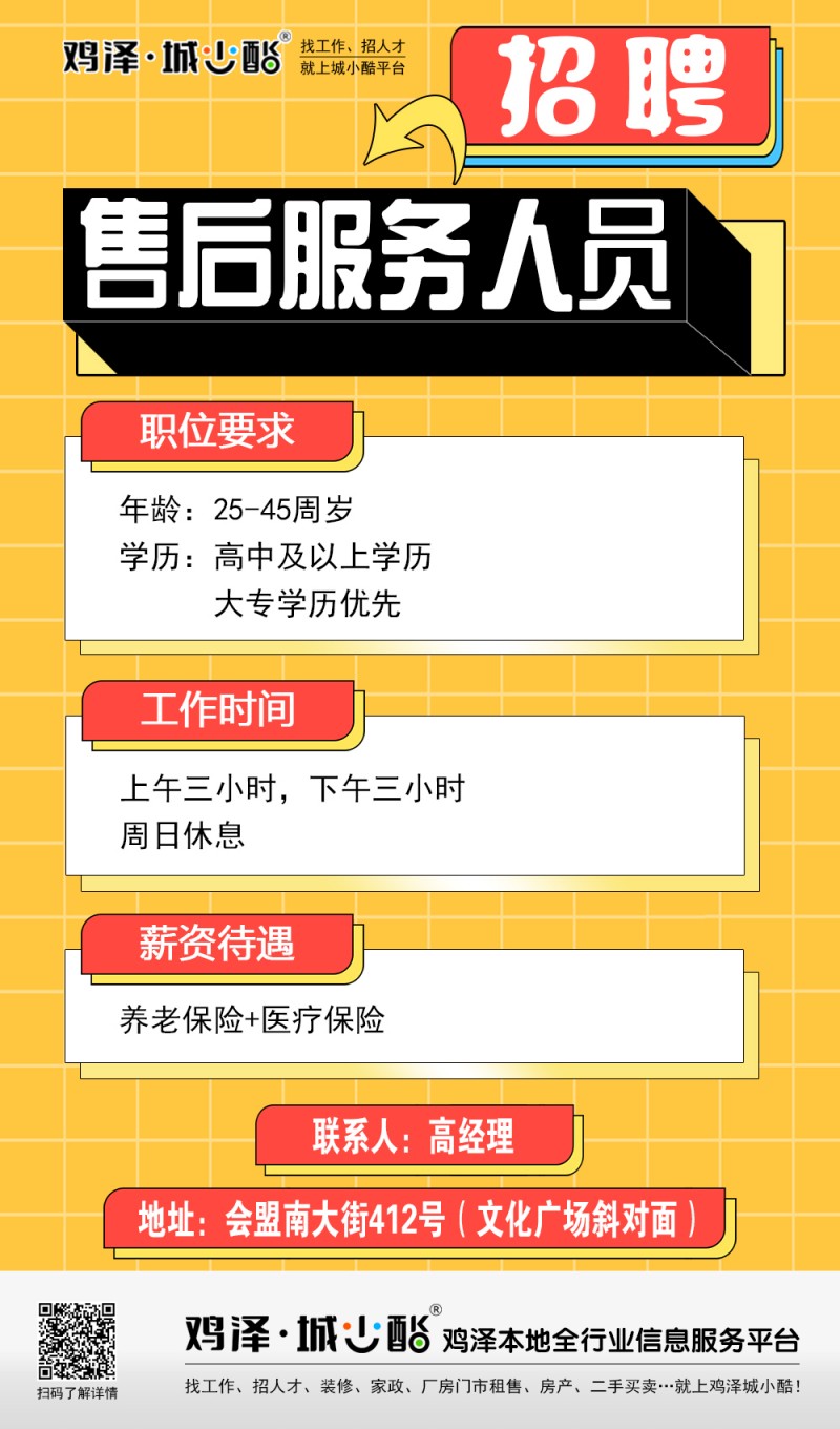 招募售后服务人员,年龄25-45周岁,上午三小时,下午三小时,周日休息,养老保险+医疗保险,地址:会盟南大街412号(文化广场斜对面)