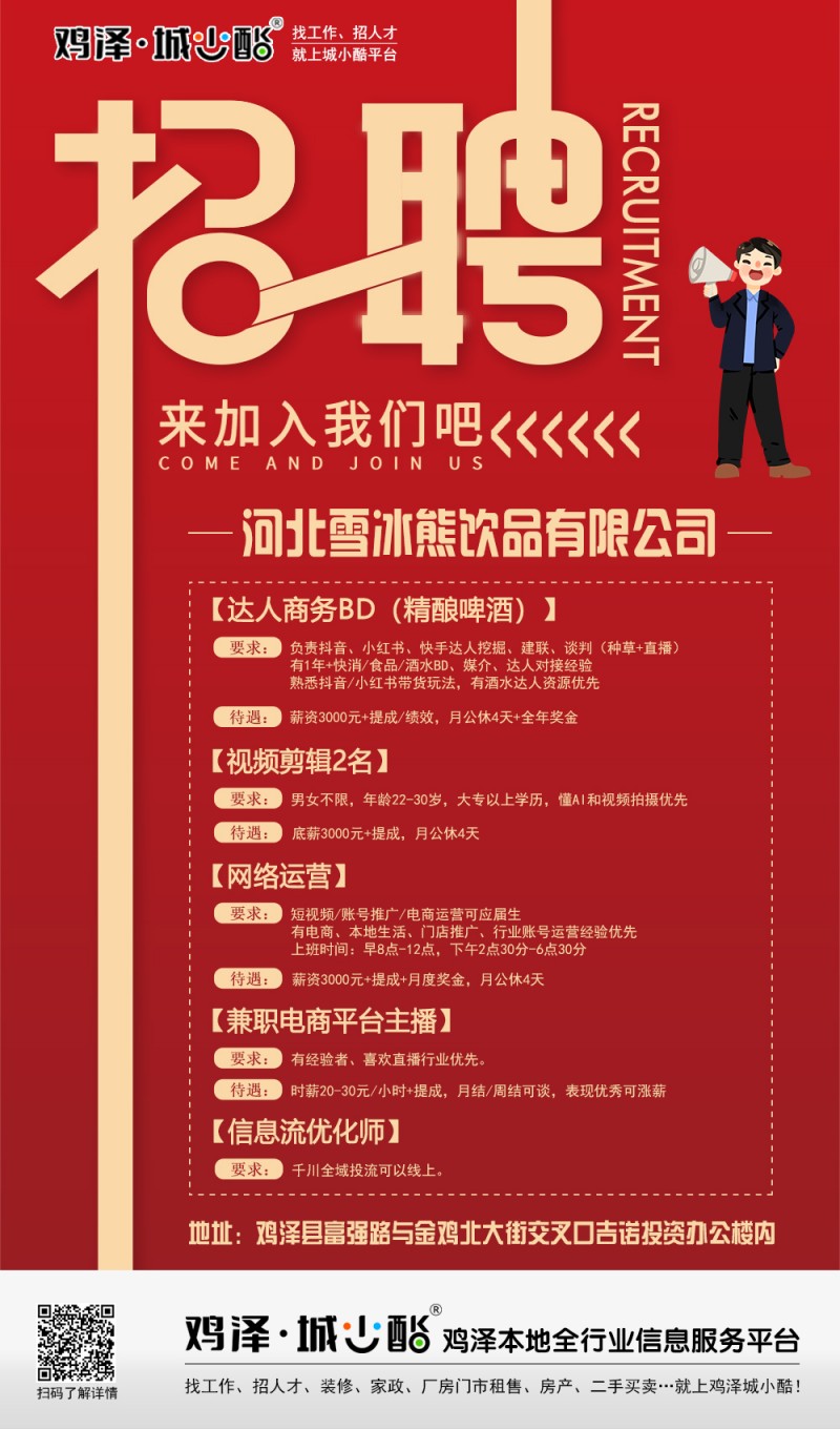河北雪冰熊饮品有限公司招聘达人商务BD(精酿啤酒) 薪资3000+提成/绩效,地址:鸡泽县吉诺投资办公楼内